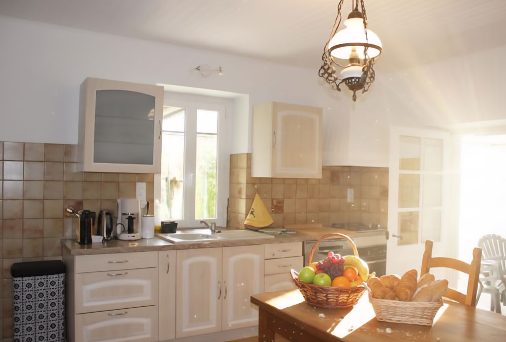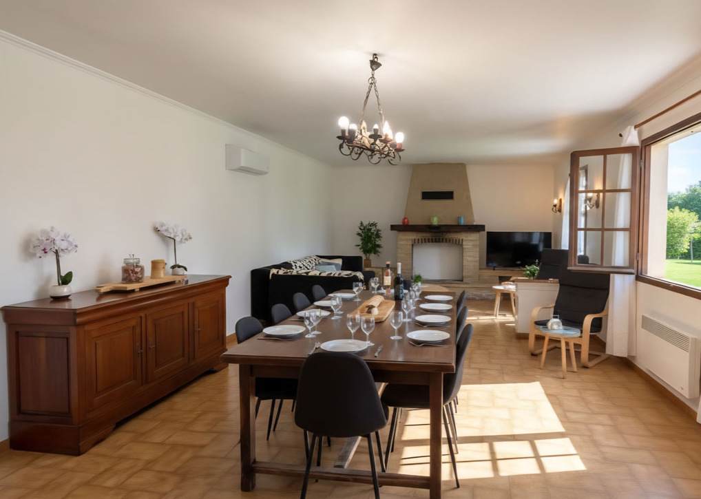 LE MAS : CHARME ET CONVIVIALITÉ L’intérieur allie authenticité et confort avec ses murs en pierres sèches et ses poutres apparentes. Le grand salon chaleureux dispose d’une cheminée monumentale et de larges canapés. La salle à manger est dotée d’une table de ferme massive pour plus de 15 convives. Vous profiterez aussi d’une cuisine de campagne entièrement équipée, de 2 salles d’eau et de 2 WC.