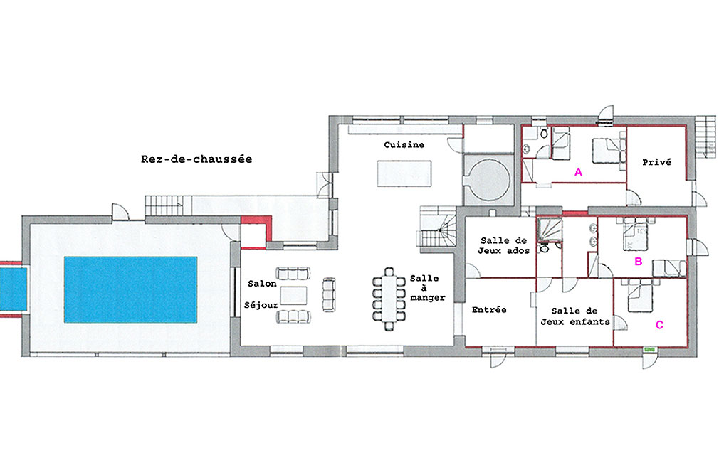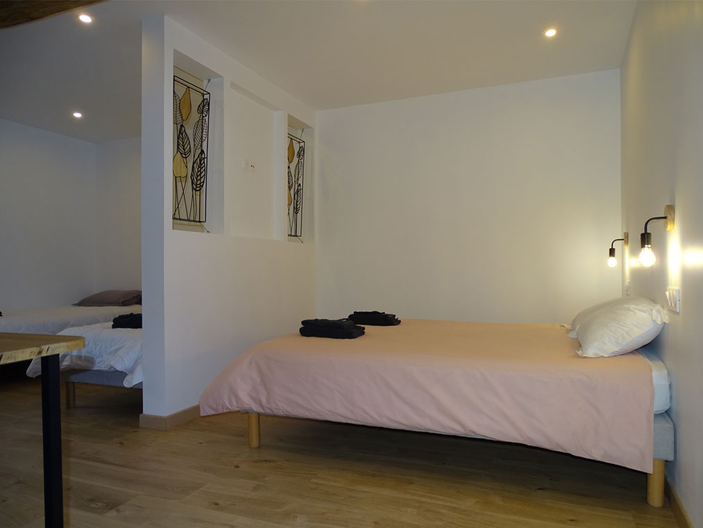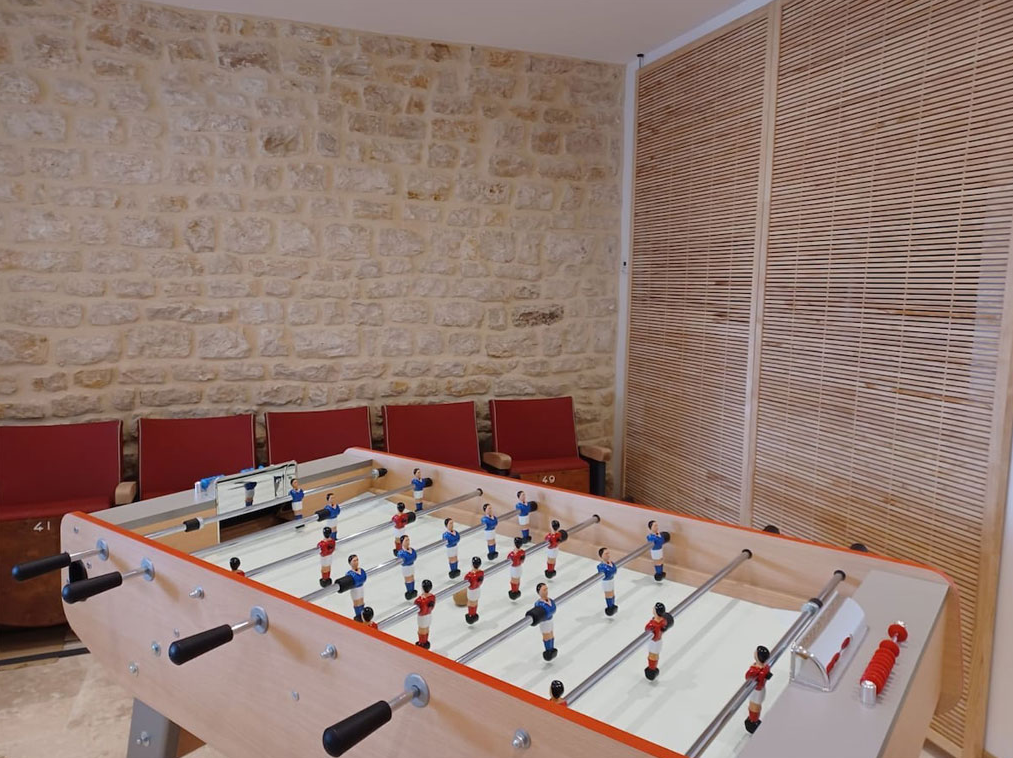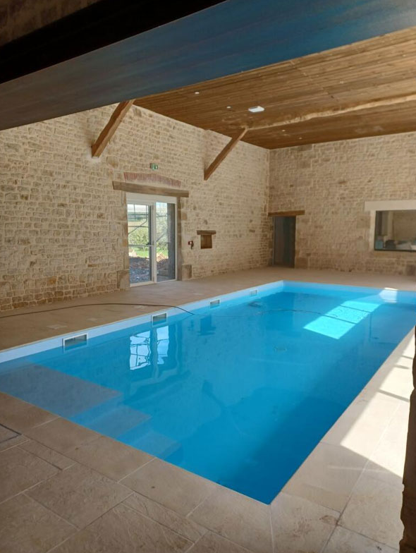 Côté Gîte Ce gîte comprend 12 chambres et 11 salles d’eau avec WC. Il dispose d’une grande pièce à vivre (cuisine équipée, salle à manger pour 40 personnes et salon) avec vue sur une piscine couverte et chauffée. Deux salles de jeux complètent l’espace.